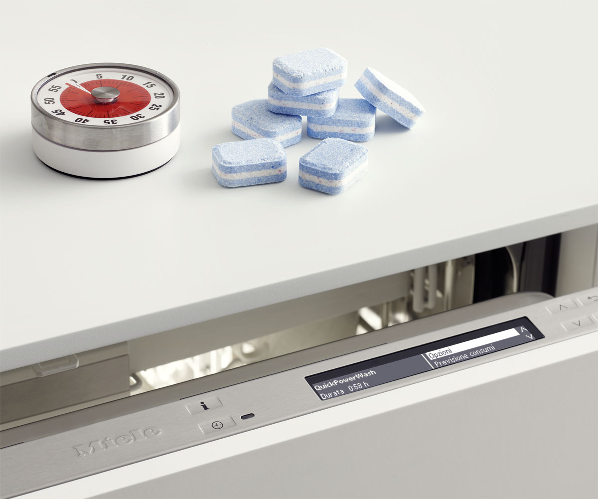 Grazie al nuovo programma di lavaggio QuickPower Wash e alle UltraTabs Multi a scioglimento rapido di Miele, create appositamente per il programma, le vostre stoviglie saranno lavate e asciugate alla perfezione in 58 minuti. In tempi rapidi con una resa di lavaggio in classe A.*