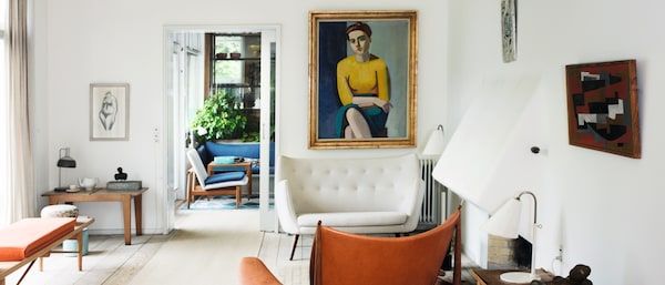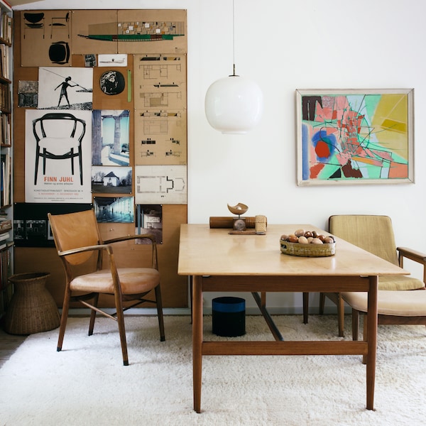 La casa fu pensata “dall’interno verso l’esterno”, privilegiando la qualità e la funzionalità degli spazi interni. Dall’esterno la residenza appare semplice e tipicamente nordica, immersa in una proprietà di 1.700 metri quadrati adiacente al parco Ordrupgaard. La struttura è composta da due volumi bianchi con tetto a spiovente, collegati da un ingresso che si apre sul giardino. In un lato si trovano l’ampio soggiorno e lo studio di Juhl, mentre nell’altro blocco sono collocati cucina, sala da pranzo e camere da letto con bagno. Gli interni, luminosi e ampi, si affacciano sul verde attraverso grandi finestre e aperture, e sono ravvivati da soffitti nei toni arancio e crema. Un progetto, frutto della collaborazione tra Juhl e la prima moglie, Inge-Marie Skaarup, che testimonia la sua visione del design, dove ogni dettaglio è curato con precisione.