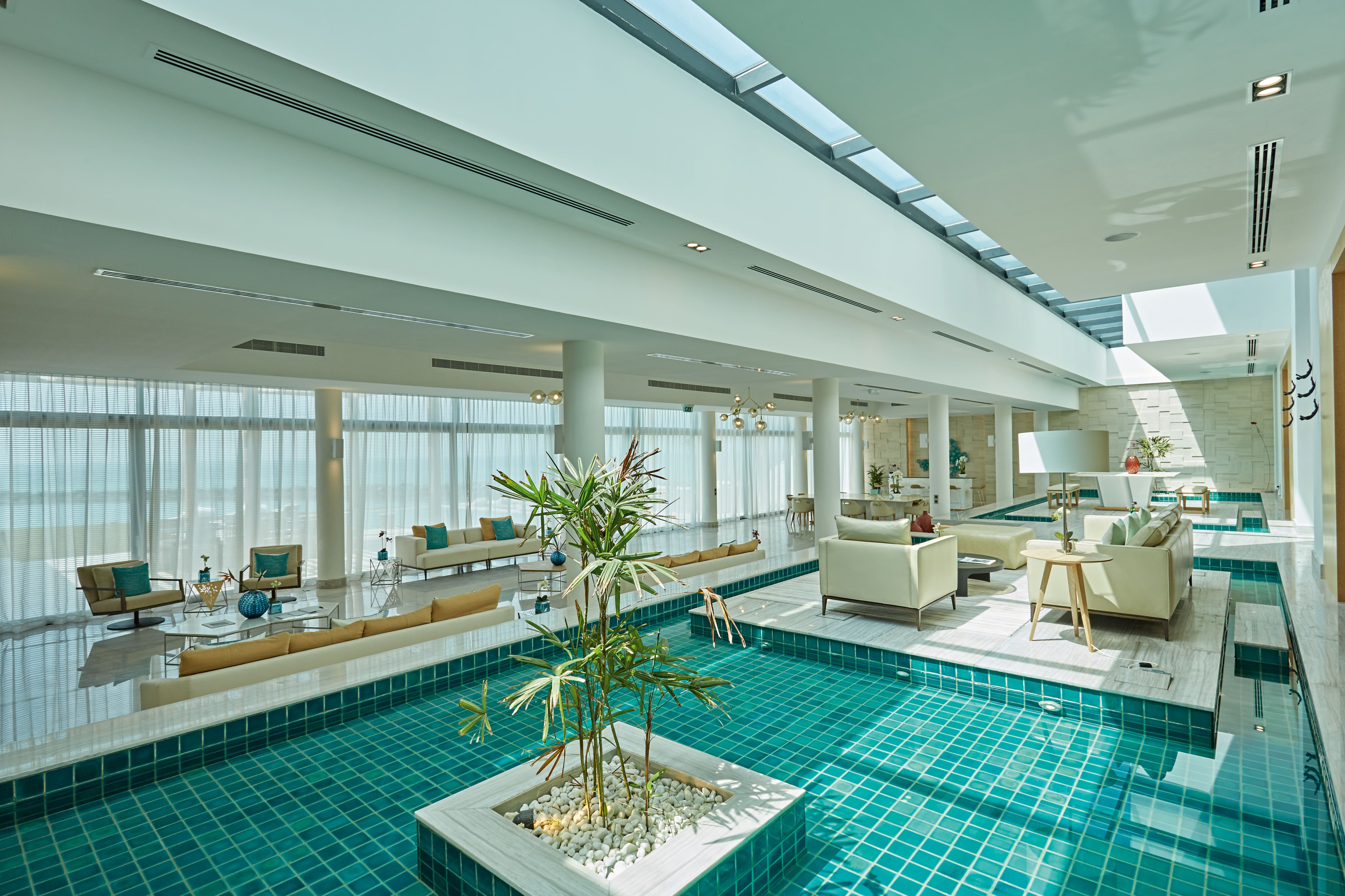 Le ville sull'acqua e sulla spiaggia, che punteggiano la superficie dell'isola, sono state concepite per integrarsi armoniosamente con il paesaggio. Qui, il terreno si modella come un tappeto verde, che nasconde con eleganza le strutture sottostanti, creando uno spazio dove ogni residente può sentirsi completamente isolato, eppure connesso agli altri.