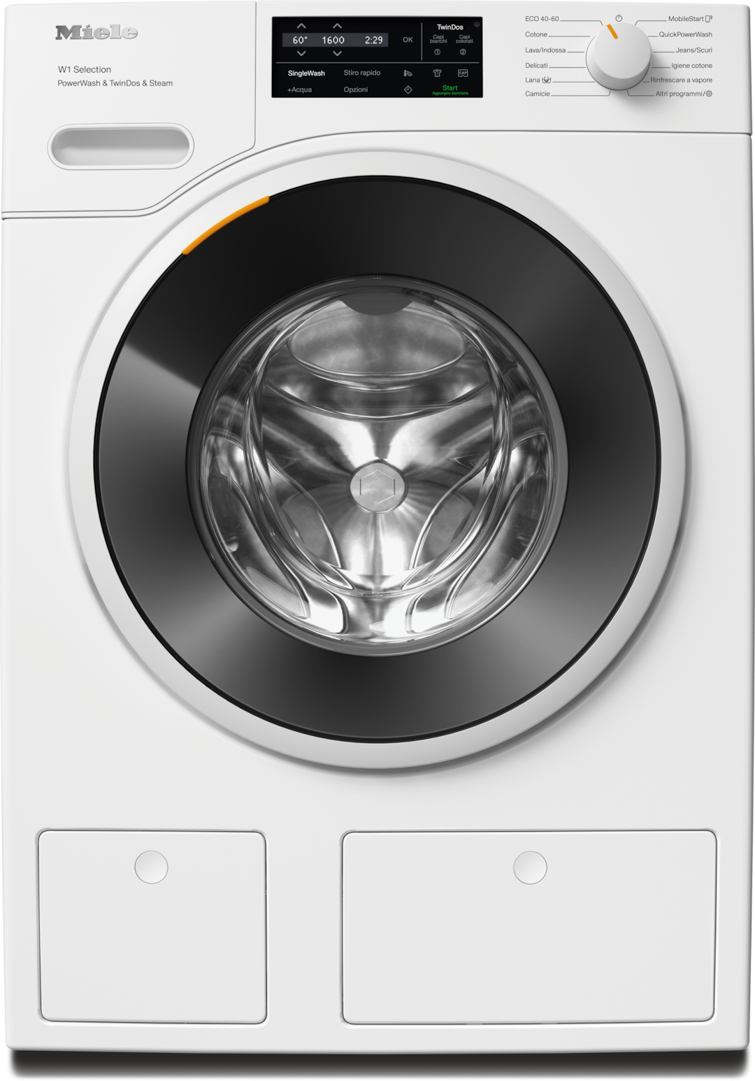 - 12.Durante la fase di sviluppo della serie di lavatrici W1, Miele ha testato i modelli e i componenti principali con 5000 cicli di lavaggio (= 5 cicli di lavaggi alla settimana per 50 settimane) in diversi programmi. Per saperne di più: miele.it/20anni