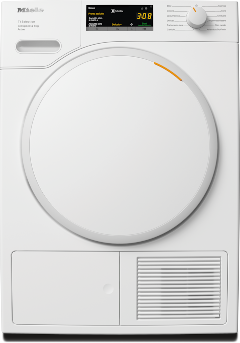 - 5.Risparmio di tempo calcolato rispetto alle asciugatrici Miele senza EcoSpeed con la stessa quantità di carico e un'efficienza energetica simile. Test effettuato con il programma “Cotone” a pieno carico.