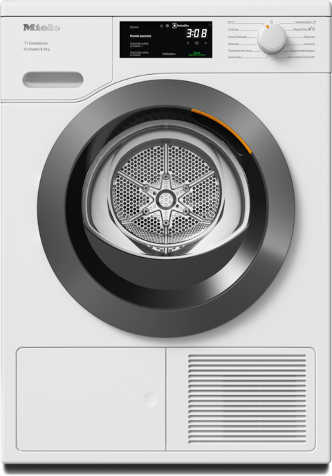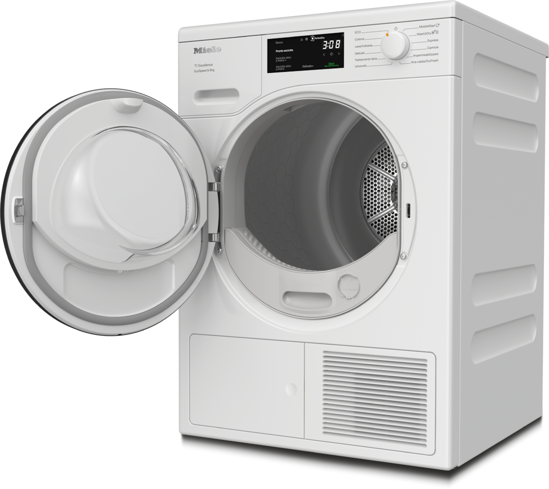 - 5.Risparmio di tempo calcolato rispetto alle asciugatrici Miele senza EcoSpeed con la stessa quantità di carico e un'efficienza energetica simile. Test effettuato con il programma “Cotone” a pieno carico.
